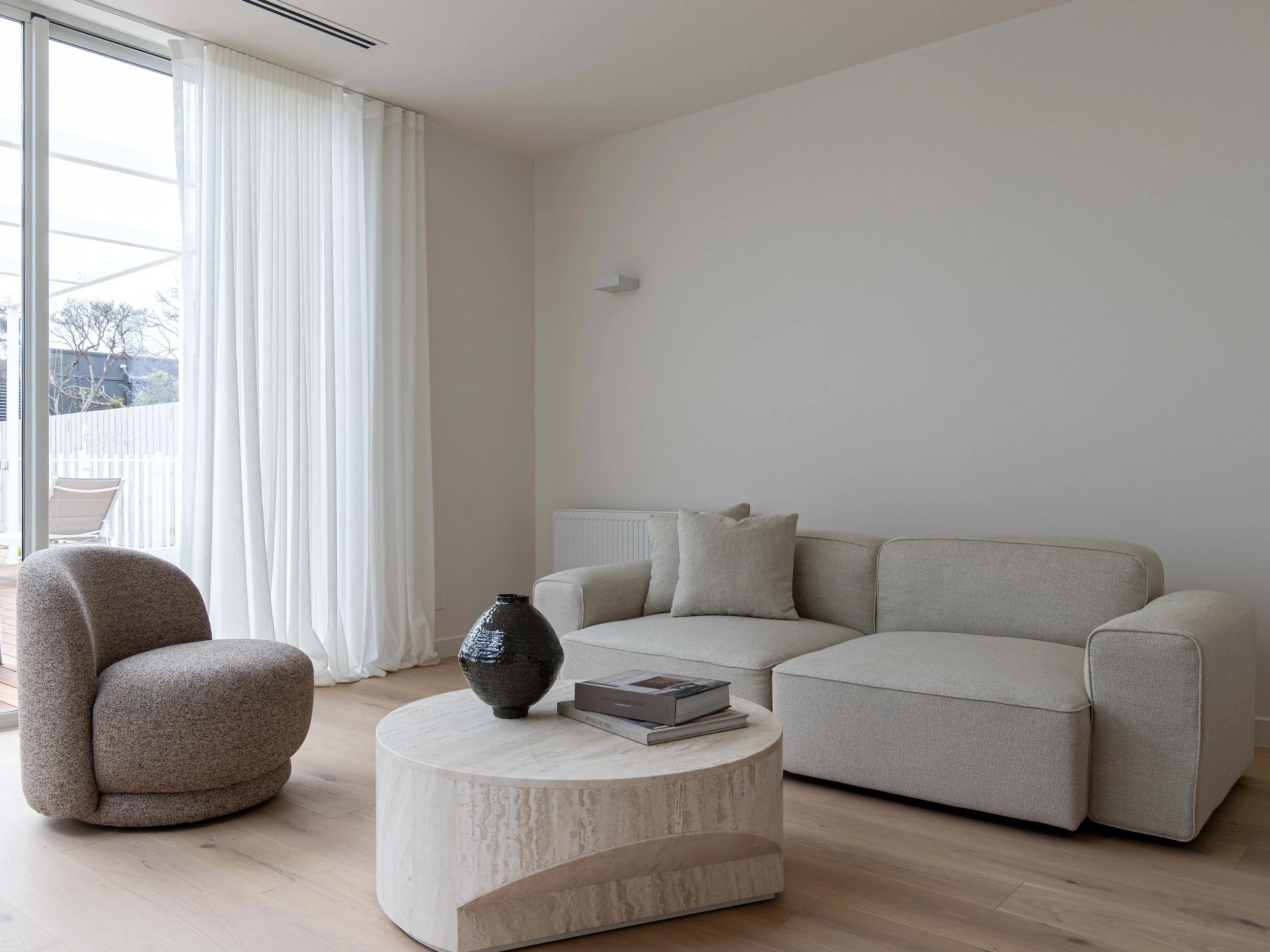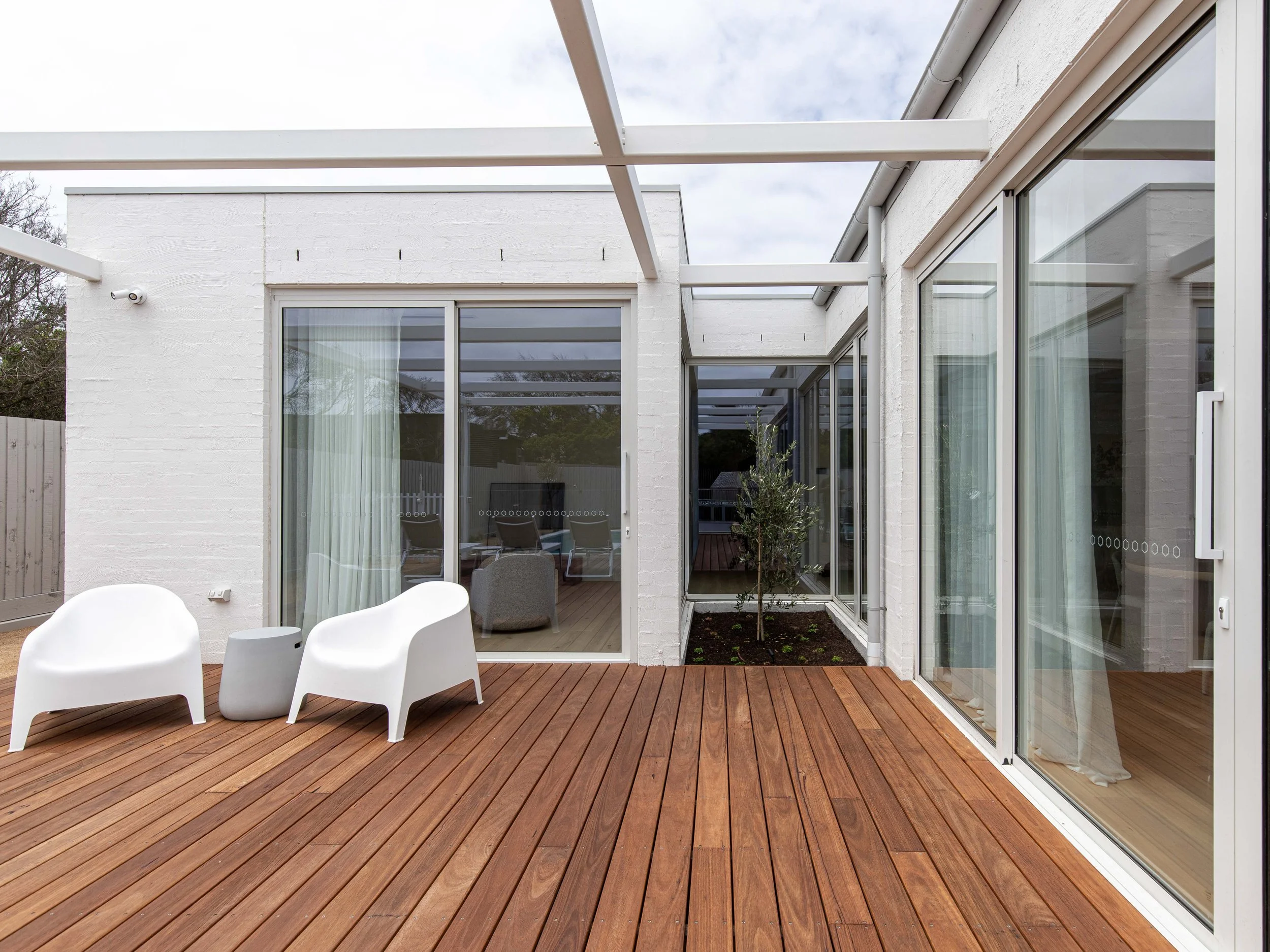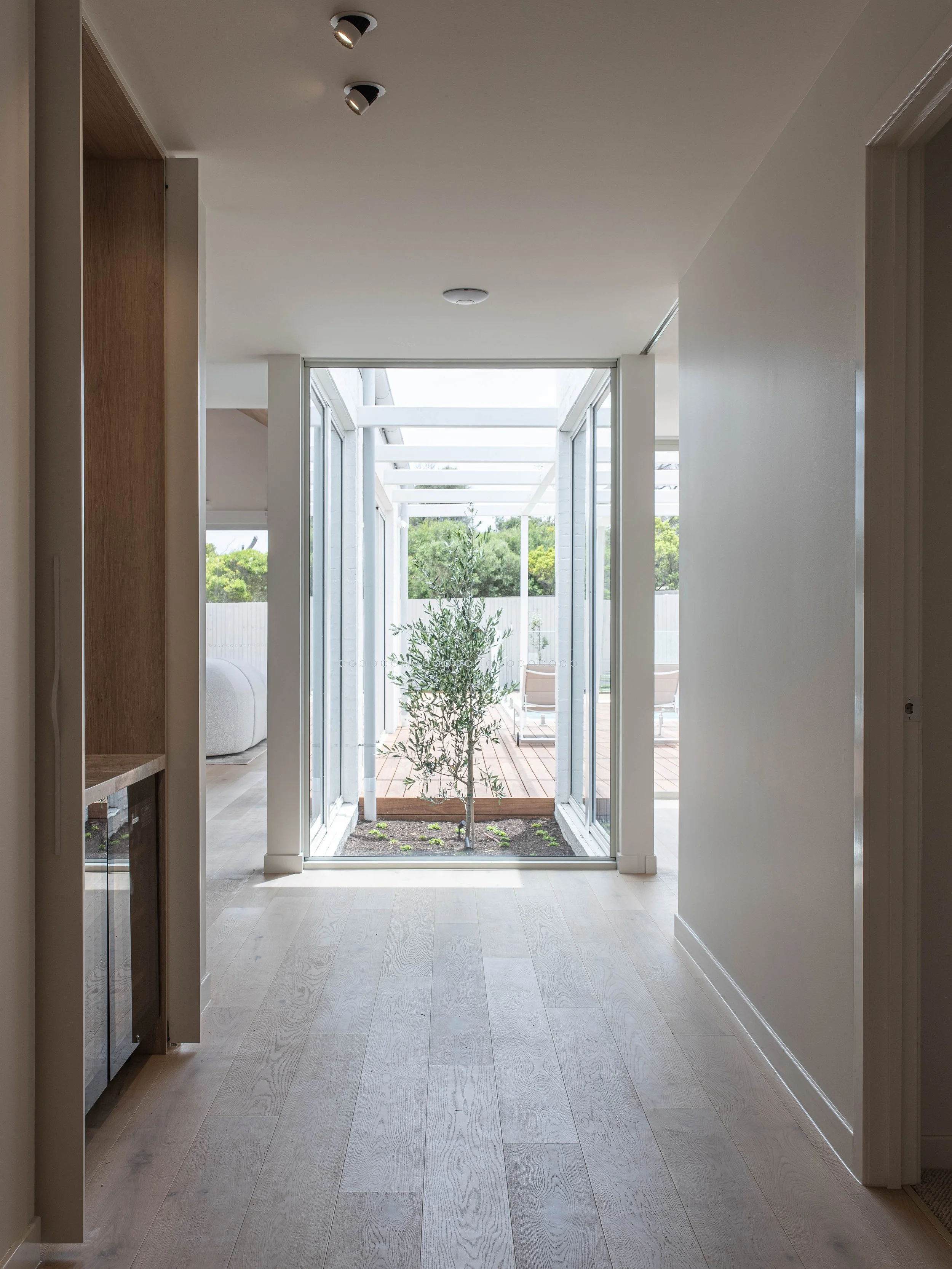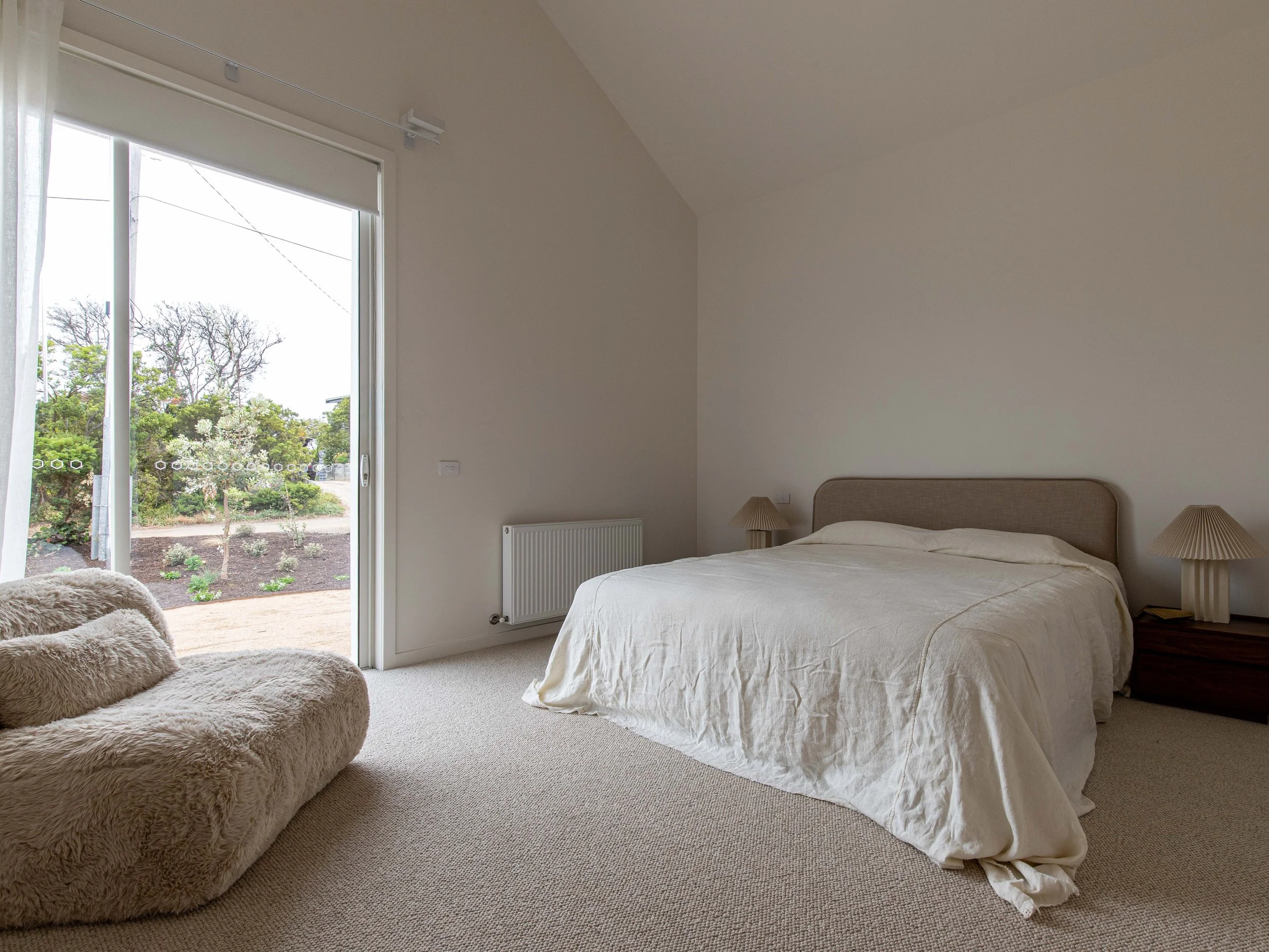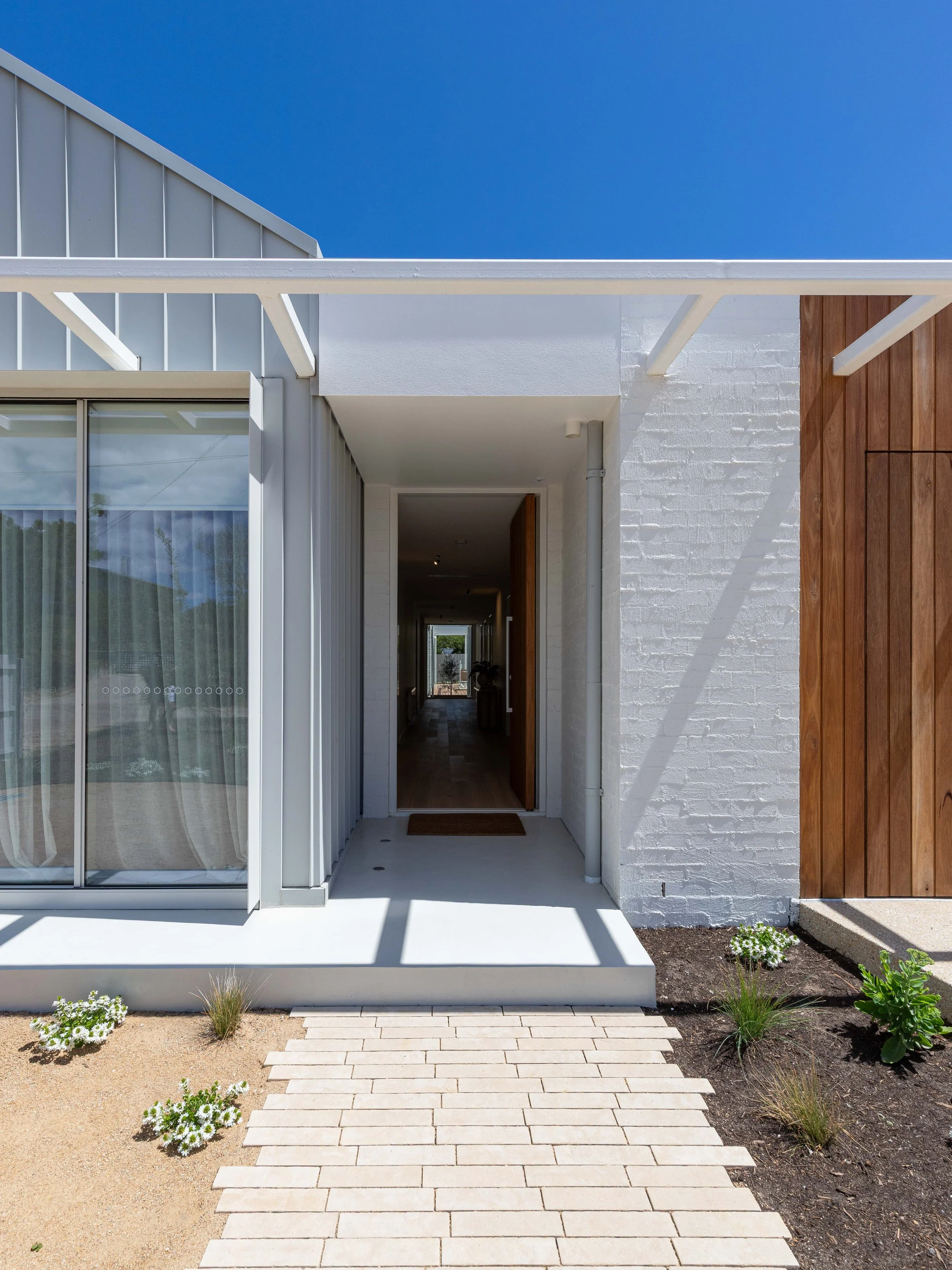 A bespoke contemporary home located on the Mornington Peninsula. Designed to suit the specific rhythms of coastal life, the architectural response utilises a textured palette of painted brickwork, timber accents, and steel cladding to create a refined, modern silhouette. The layout is logically zoned, with the private bedroom wing situated toward the front of the home and the living space toward the rear.