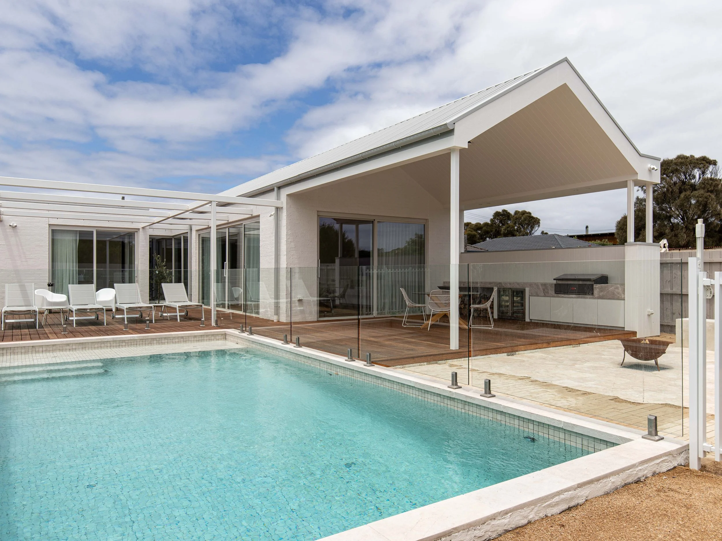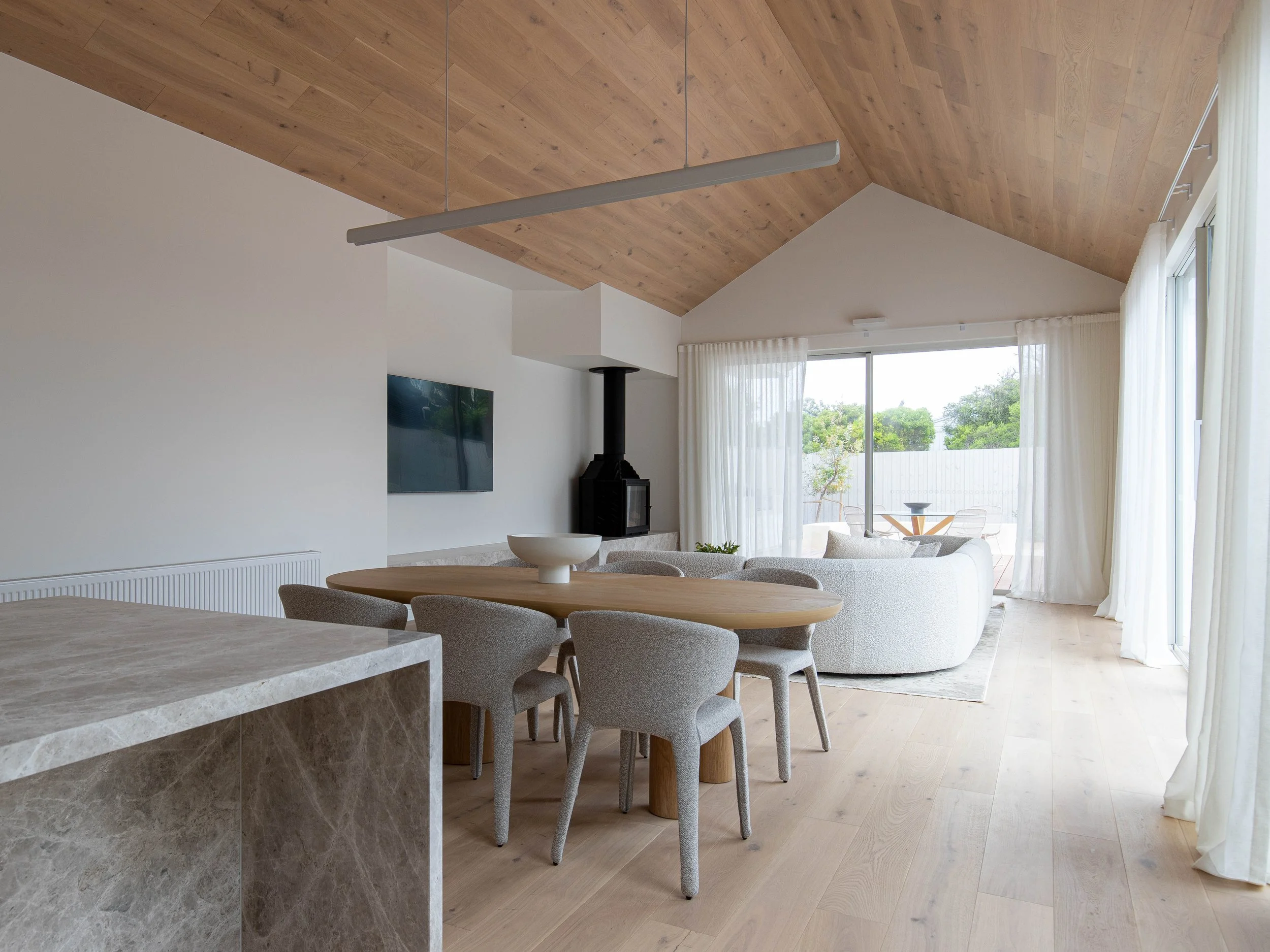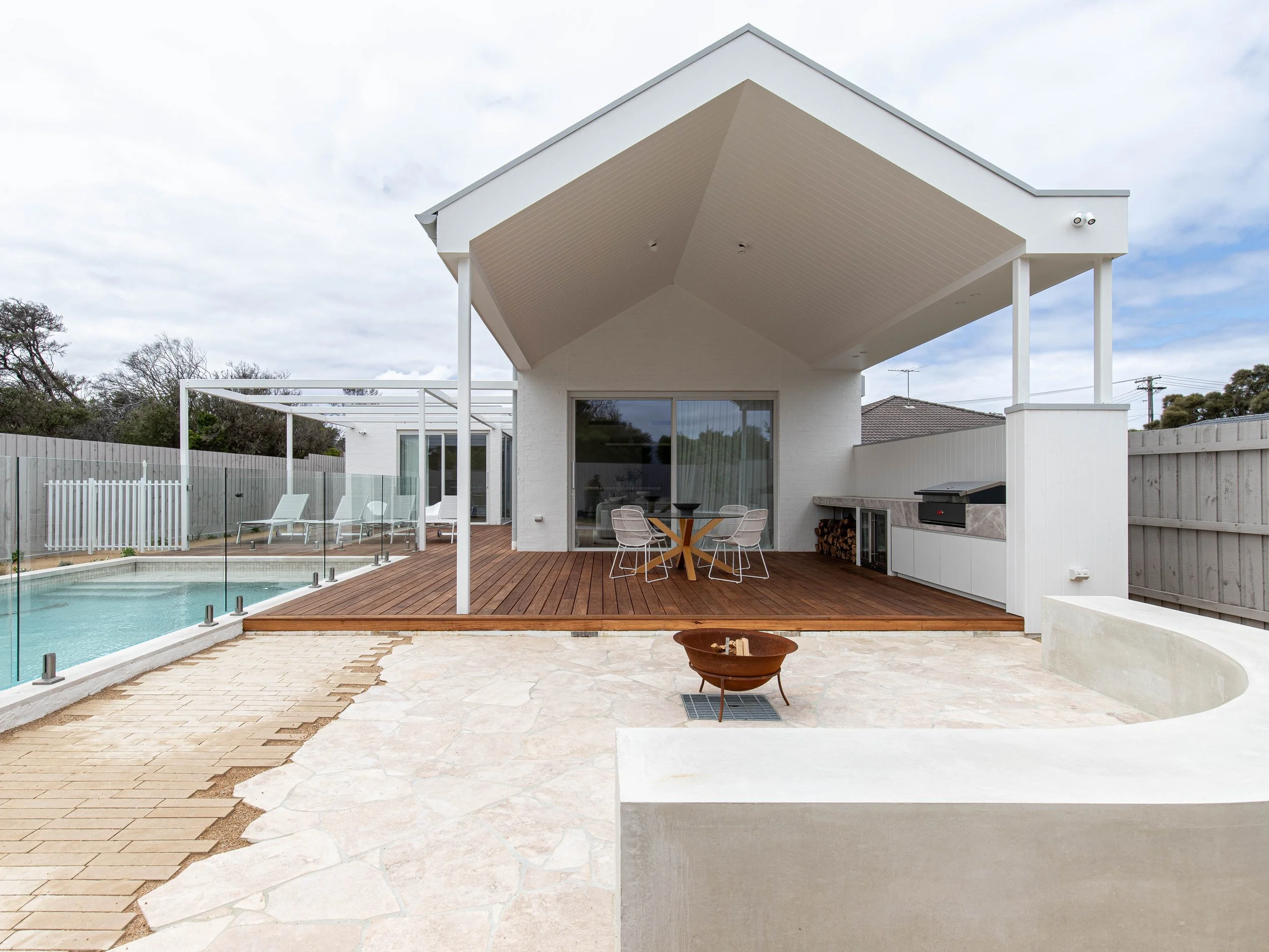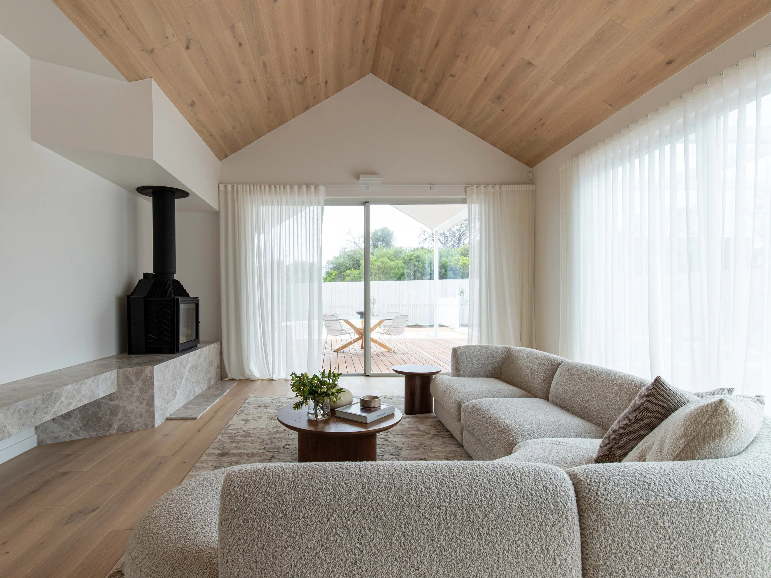 The rear of the home opens into an expansive social hub oriented to maximise natural light and cross-ventilation. This living area is defined by a dramatic vaulted timber ceiling and a minimalist stone fireplace, creating a sense of volume that feels both airy and grounded. Large sliding glass doors facilitate an effortless transition to a gabled alfresco deck and pool area, ensuring the home is perfectly equipped for the lifestyle of the peninsula.